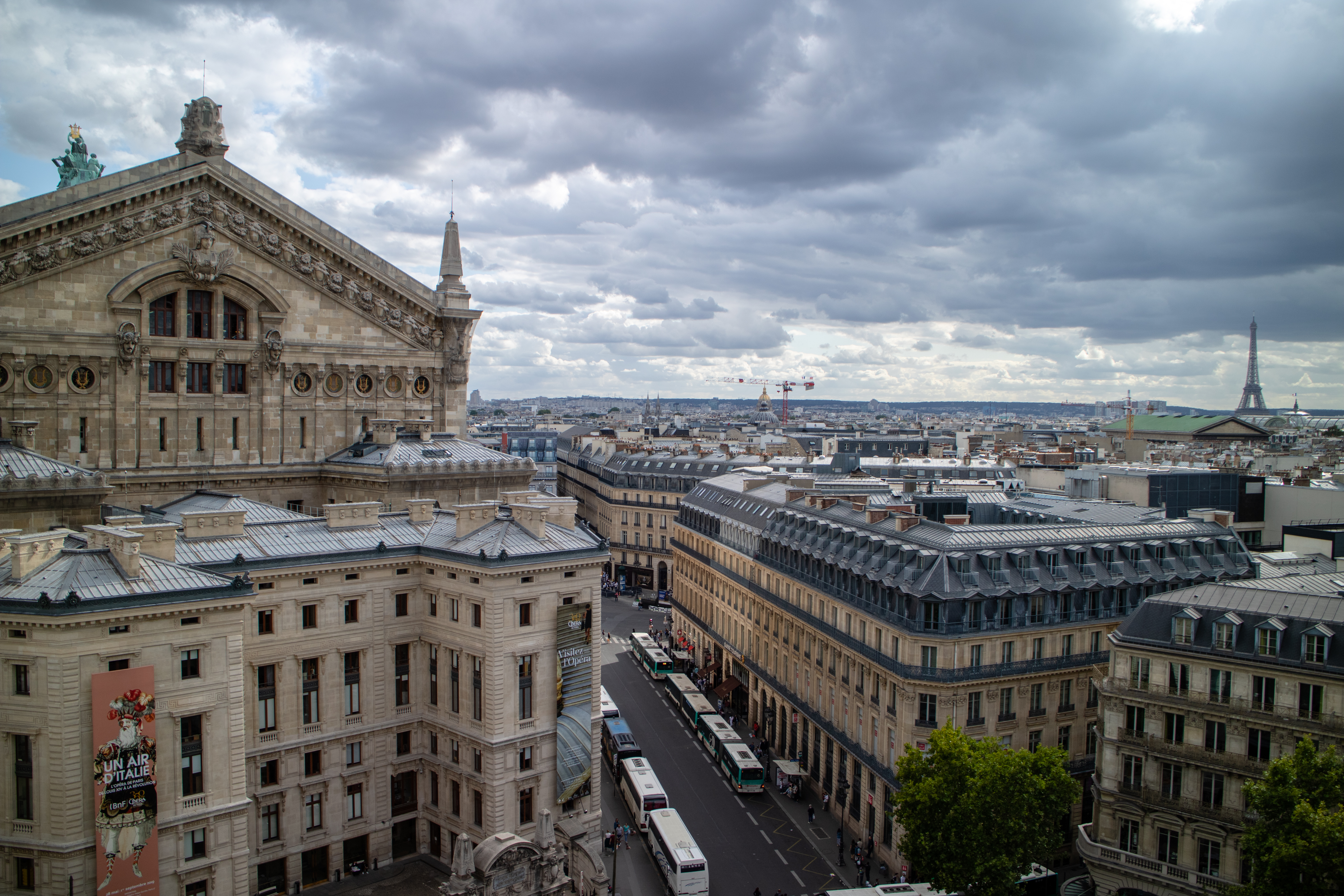 Up to this point we have not seen the famous Eiffel Tower yet, and we decided that we want to start moving to the other side of town to do so. We first made a stop at the Galleries Lafayette department store where you can go to the roof (for free) and get a pretty view of Paris, and the Eiffel tower from far away. I played a bit with my zoom lens to get another shot of the Sacre Coeur, this time 2km away.