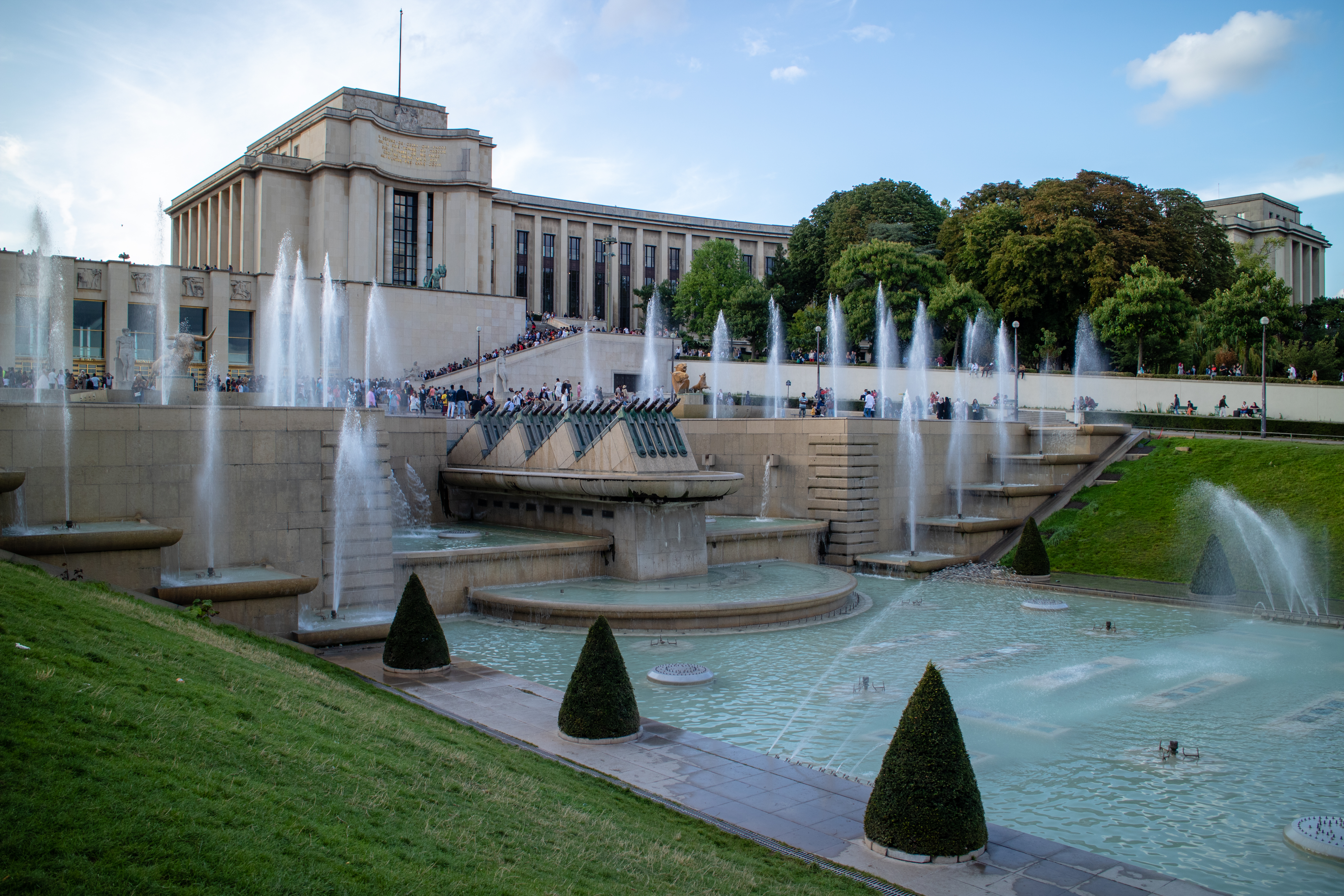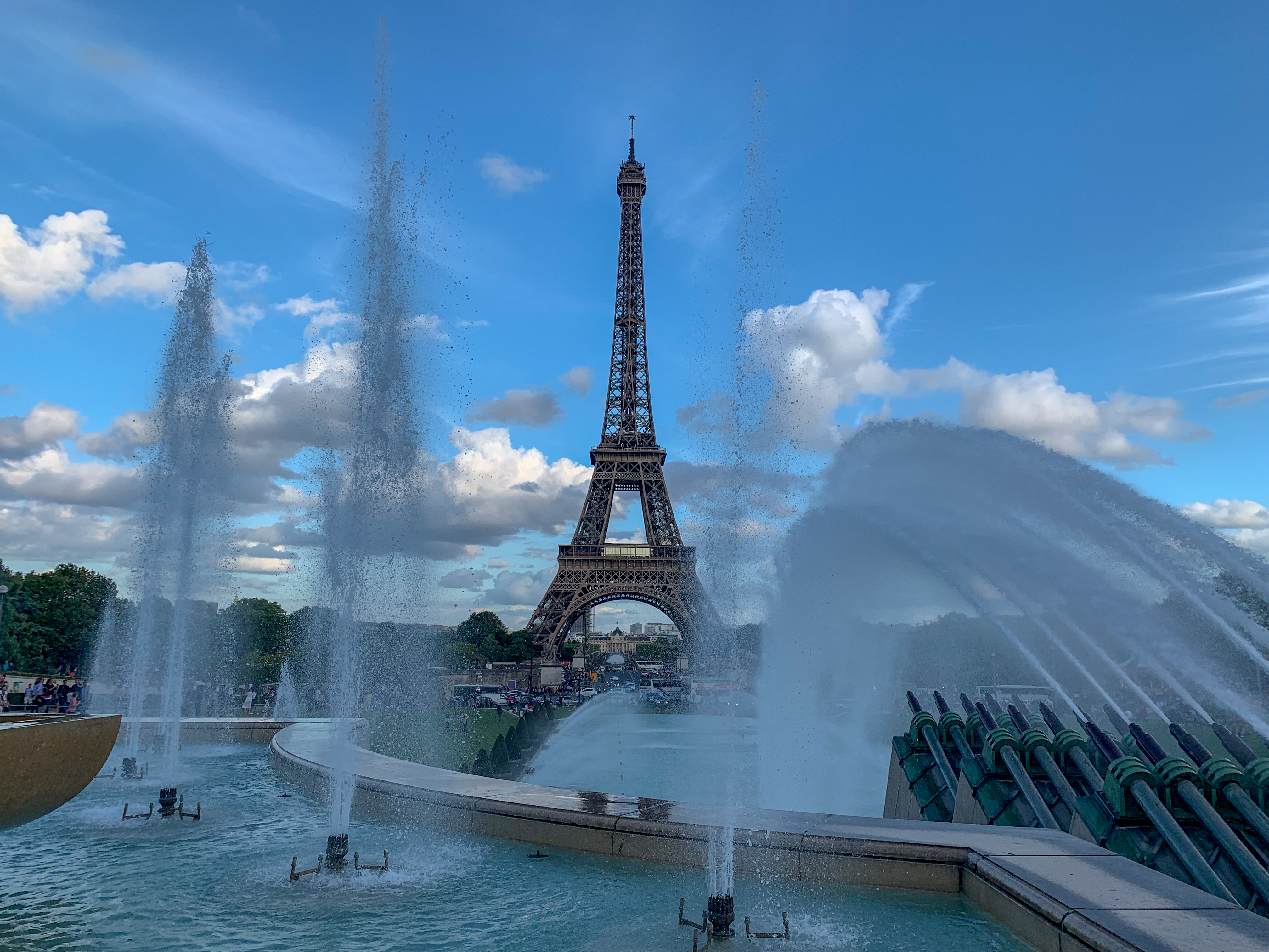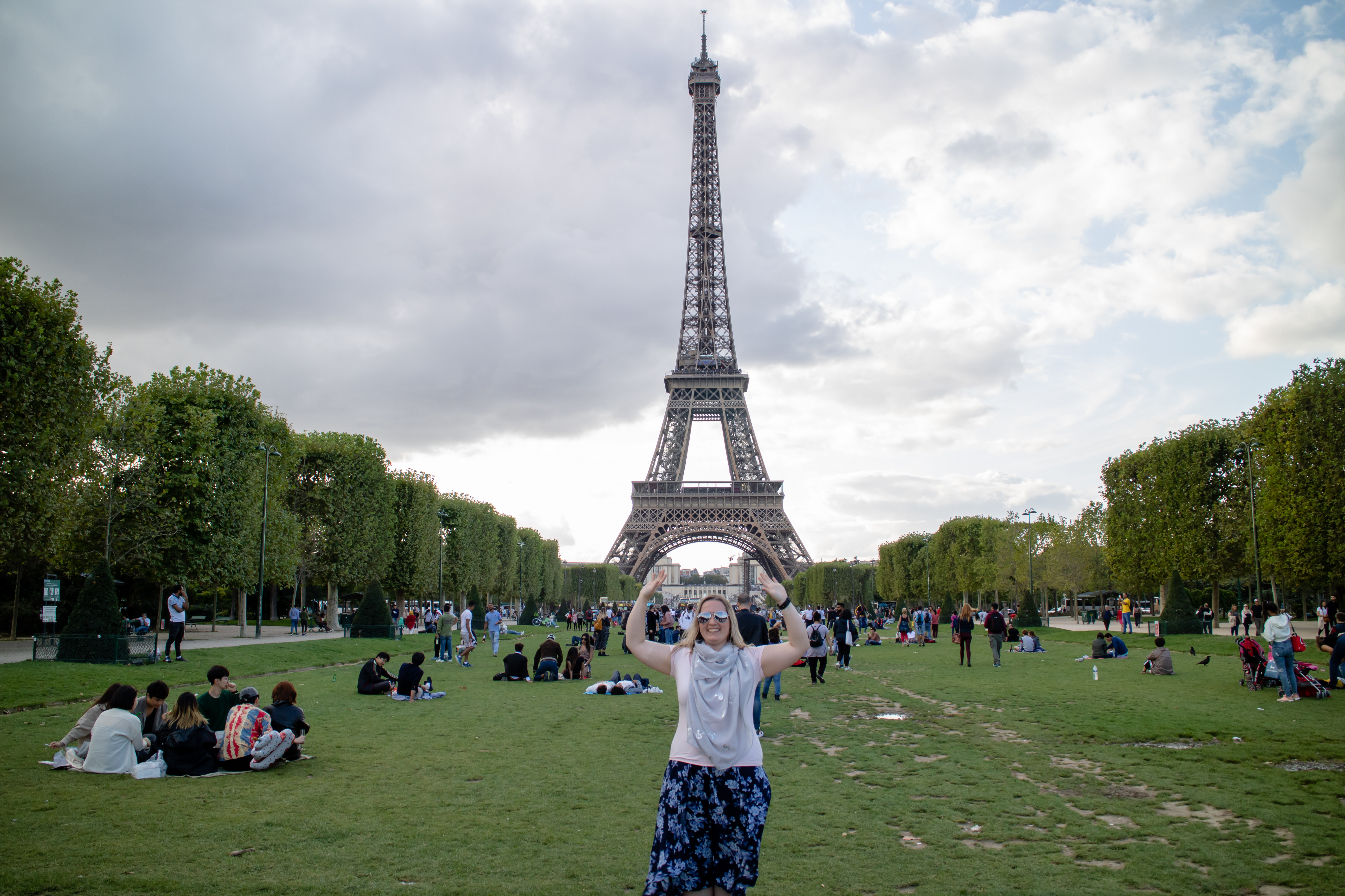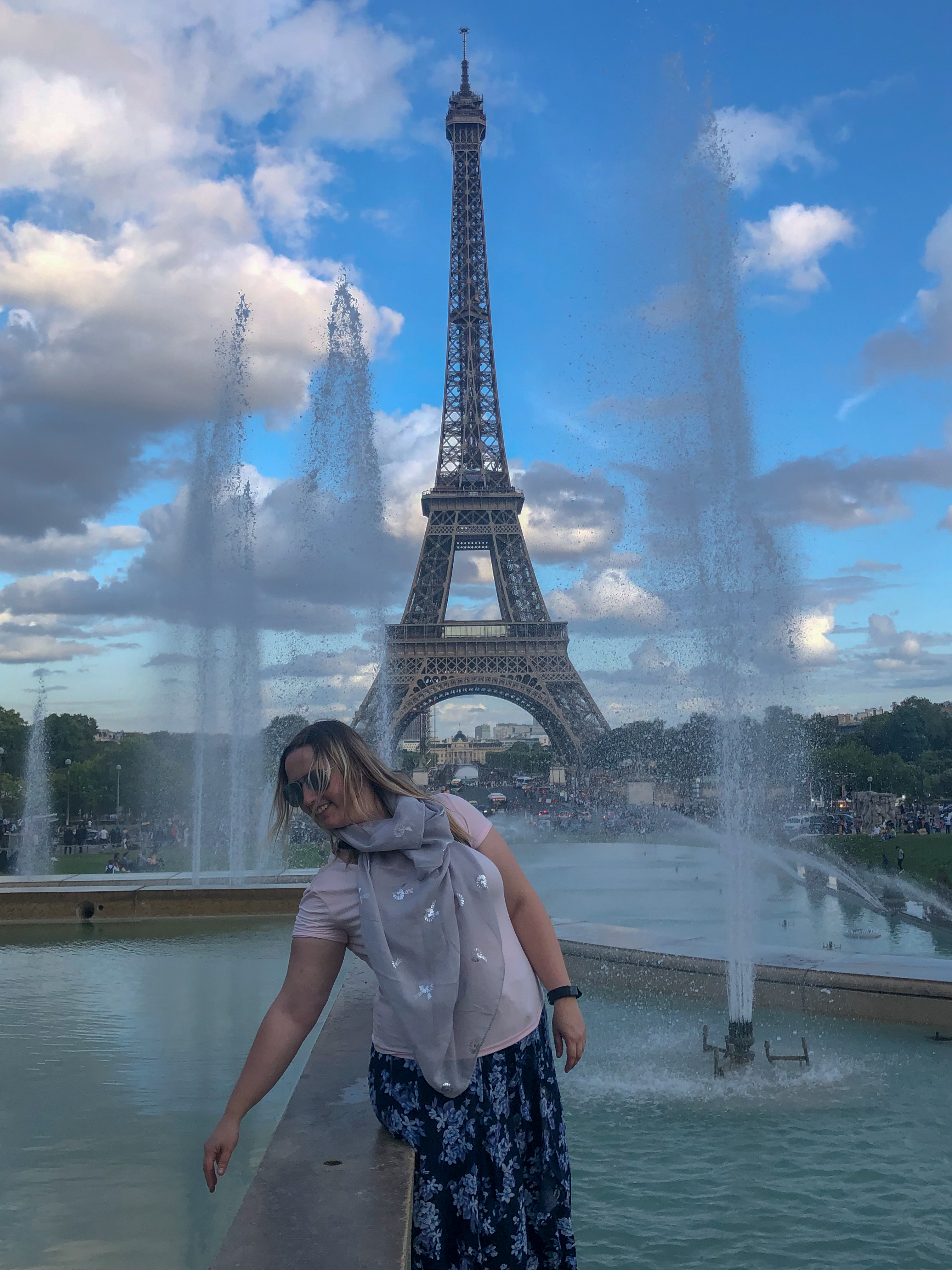 While sitting in the park there were at least 4 people coming by trying to sell us beer, wine, cigarettes and Eiffel Tower souvenirs. We managed to dodge them mostly and after lunch started making our way even closer to the tower. We realised that the prettiest view is probably on the other side where the fountains are – at least according to all the photos we’ve seen before and embarked on a journey to the other side, while posing for several types of photos at different angles of the tower.