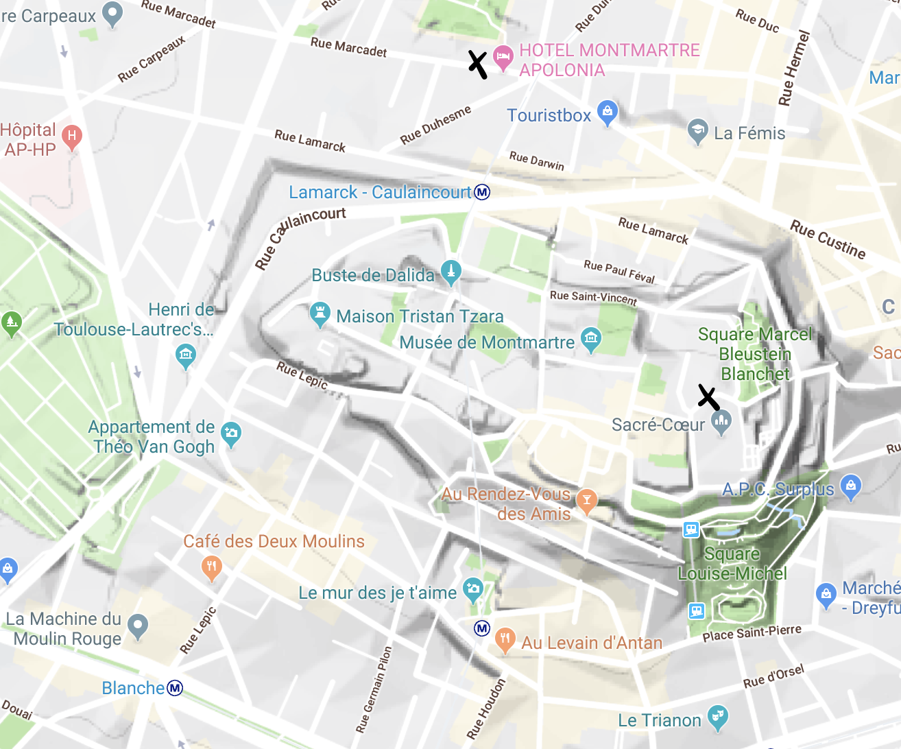 The hotel we stayed at was in Montmartre, which is a really nice area to walk around in. It is also quite close to the Sacre Coeur, so we decided to go there next. Even though we were walking distance from there, we did not plan for the elevation. Here is a map with the 2 X’s marking where we stayed and where the Sacre Coeur is.